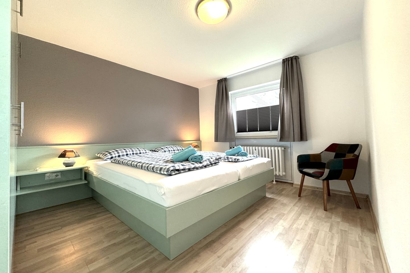Zwei Schlafzimmer mit Laminatboden bieten erholsamen Schlaf. Das Hauptschlafzimmer ist mit einem Doppelbett (2 Matratzen á 0,90x2,00m) und einem Kleiderschrank ausgestattet und das kleinere Schlafzimmer mit einem Einzelbett (Matratze á 0,90x2,00m) und einem Kleiderschrank. Im Badezimmer befindet sich eine Dusche, WC und Waschbecken sowie ein Spiegel und ein Fenster. Bettwäsche und Handtücher stehen Ihnen selbstverständlich zur Verfügung, ebenso wie eine Waschmaschine zur Eigennutzung, ein Wäscheständer, ein Staubsauger sowie diverse Badezimmer- und Küchenutensilien. Das Anwesen ist ein Nichtraucherhaus und eignet sich auch für Gäste mit Haustier, solange es sich um maximal ein Tier handelt.